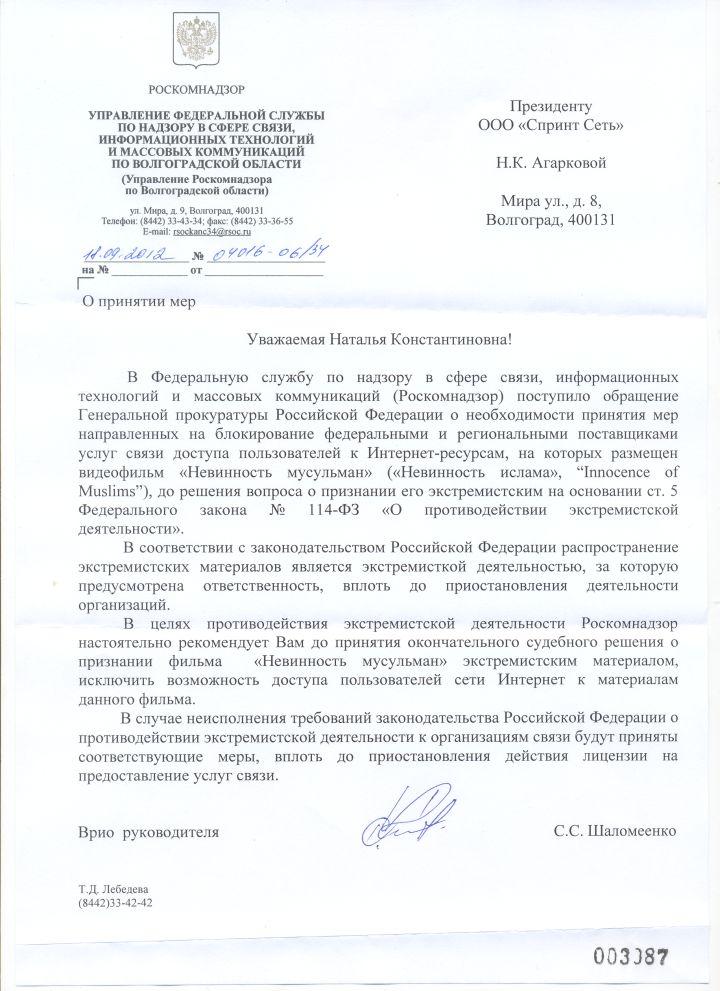 В письме провайдерам настоятельно рекомендуют исключить возможность доступа пользователей сети к материалам фильма «Невинность мусульман» до вынесения судебного решения о признании его экстремистским. При этом Роскомнадзор ссылается на обращение Генпрокуратуры. По словам Мезенцева, в компании-провайдере ему посоветовали звонить наверх. «Я позвонил в Спринт Сеть :-) Сказали «Звоните в Правительство», – написал он в своем «Твиттере». Несколько позднее Мезенцев сообшил, что сайты вновь стали открываться. Интернет-провайдер информацию о блокировке сайтов опроверг. Как сообщила директор компании «Спринт Сеть» Наталья Агаркова, письмо Роскомнадзора они действительно получили, но никаких ограничений не вводили и без судебного решения делать этого ни в коем случае не стали бы.В пресс-службе «ВКонтакте» пока не подтвердили информацию о блокировке соцсети в Волгограде: «Мы пока, к сожалению, по статистике не можем это подтвердить. Было это или нет, мы можем сказать только завтра. Но лично я вижу, если зайти в поиск «ВКонтакте» и выбрать фильтр «Волгоград», 22 тысячи пользователей онлайн», – сообщил пресс-секретарь соцсети Владислав Цыплухин «Газете.Ru». 17 сентября Генпрокуратура признала скандальный фильм «Невинность мусульман» экстремистским и обратилась в суд с требованием запретить его распространение в России. Впоследствии прокуратуры регионов потребовали от местных интернет-провайдеров ограничить доступ абонентов к нему и его фрагментам. В четверг прокуратура Санкт-Петербурга предписала крупным интернет-провайдерам заблокировать доступ к фильму. При этом сегодня же глава Минкомсвязи Николай Никифоров исключил возможность блокировки YouTube в России, сказав о допустимости лишь ограничения доступа к фильму: «Не будет такого. Это выдернуто из контекста. Нет, конечно», – сообщил Никифоров журналистам, отвечая на вопрос о возможности закрытия YouTube в России.