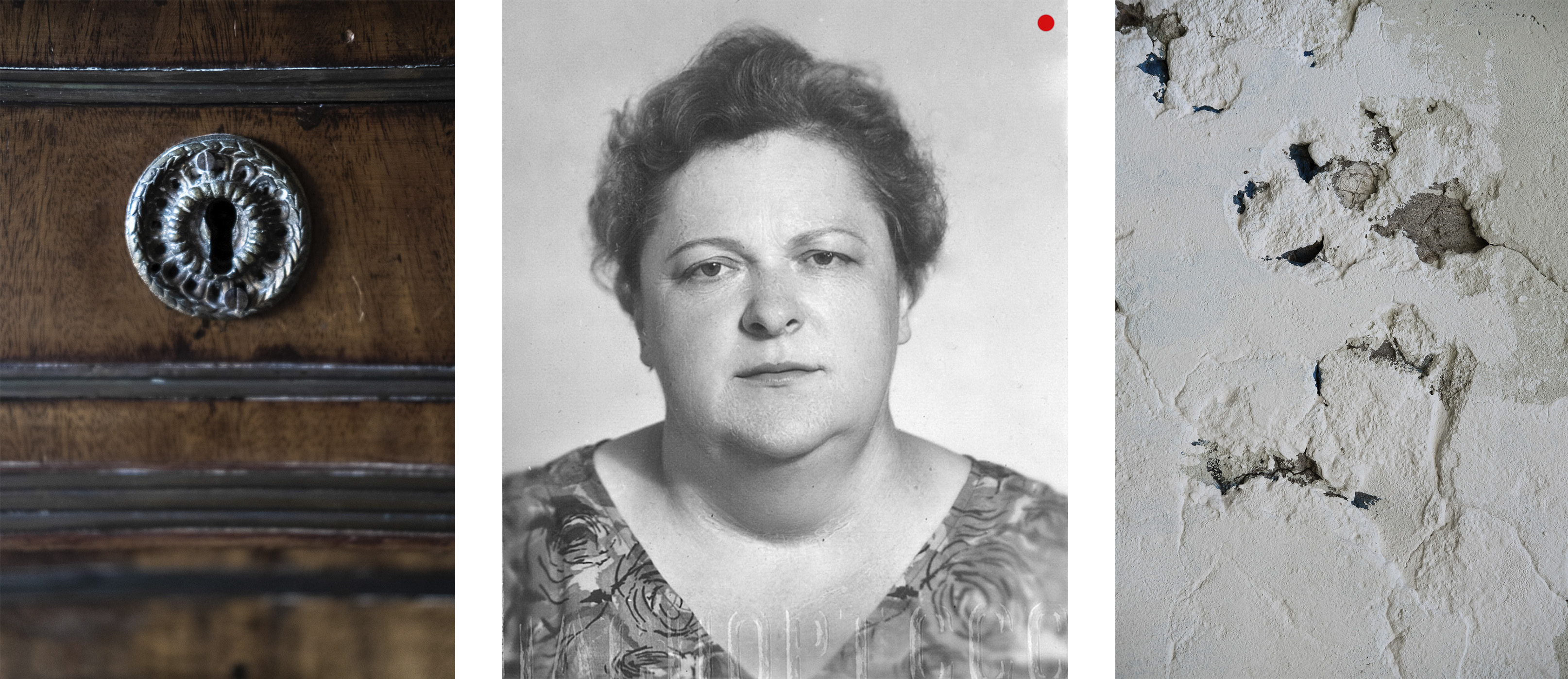 Слева: Старый шкаф для писем и документов | Посередине: Фотография Веры Алексеевны Федоренко из советского паспорта. Это фото мы использовали для памятника на могиле бабушки, установленного в 2011 году. Тогда у меня не было других фото бабушки в молодости | Справа: Стена разрушенного дома