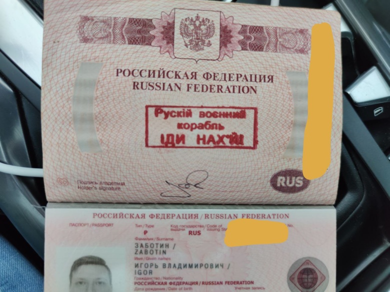 Россиянин Игорь Заботин, проживший в Украине последние семь лет, попытался выехать в Румынию, но вместо разрешительных документов получил от пограничников штамп в загранпаспорте с мемной фразой «Русский военный корабль, иди на ***», после чего почувствовал себя героем фильма «Терминал». Ему пришлось ночевать в нейтральной пограничной зоне, поскольку одобрения на пересечение границы он так и не получил, а в Украине к этому моменту начался комендантский час. Подробностями этой истории Заботин поделился с Republic.