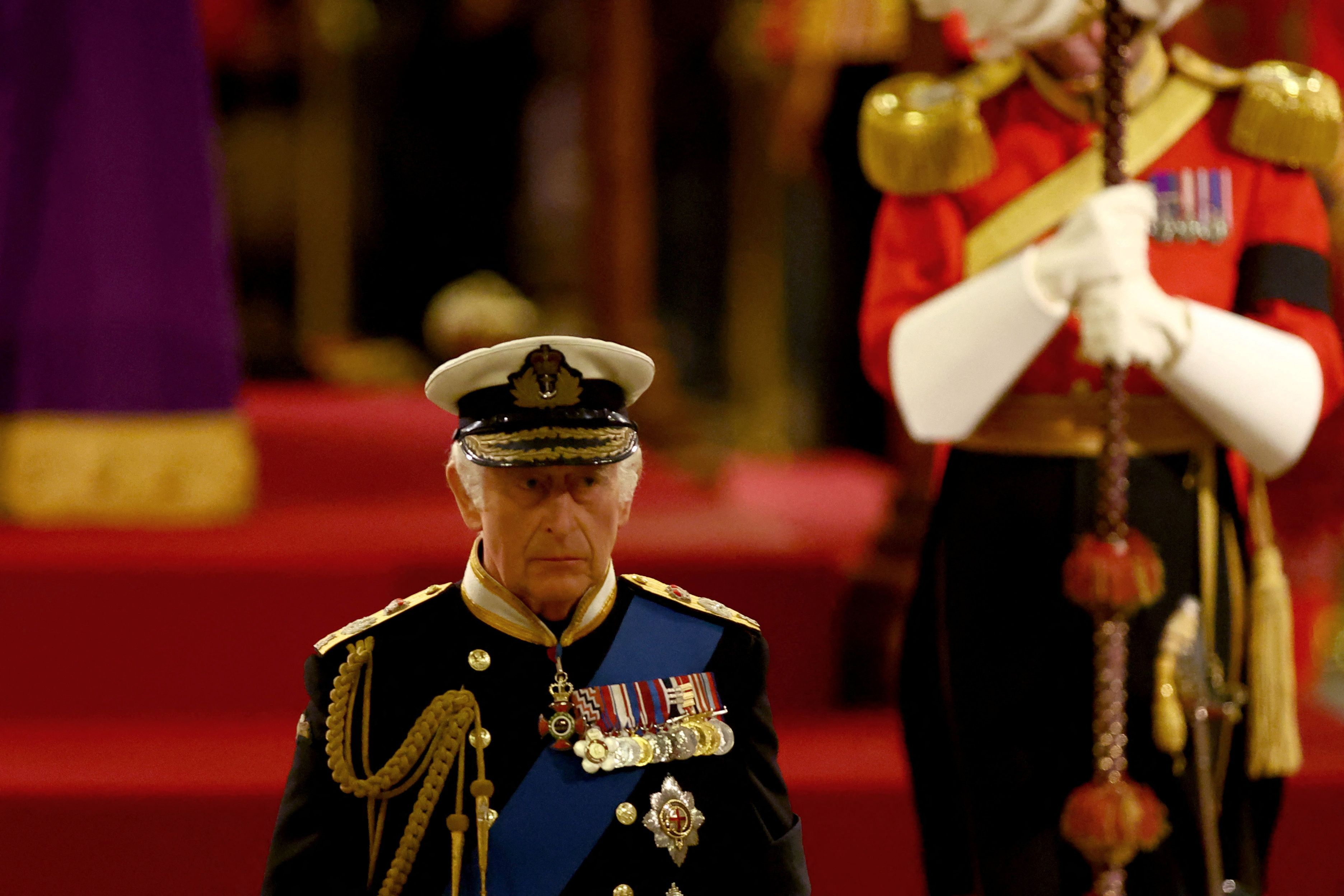 Король Карл III на панихиде по королеве Елизавете II в Вестминстер-холле в Лондоне, где находится гроб королевы. 16 сентября 2022 года