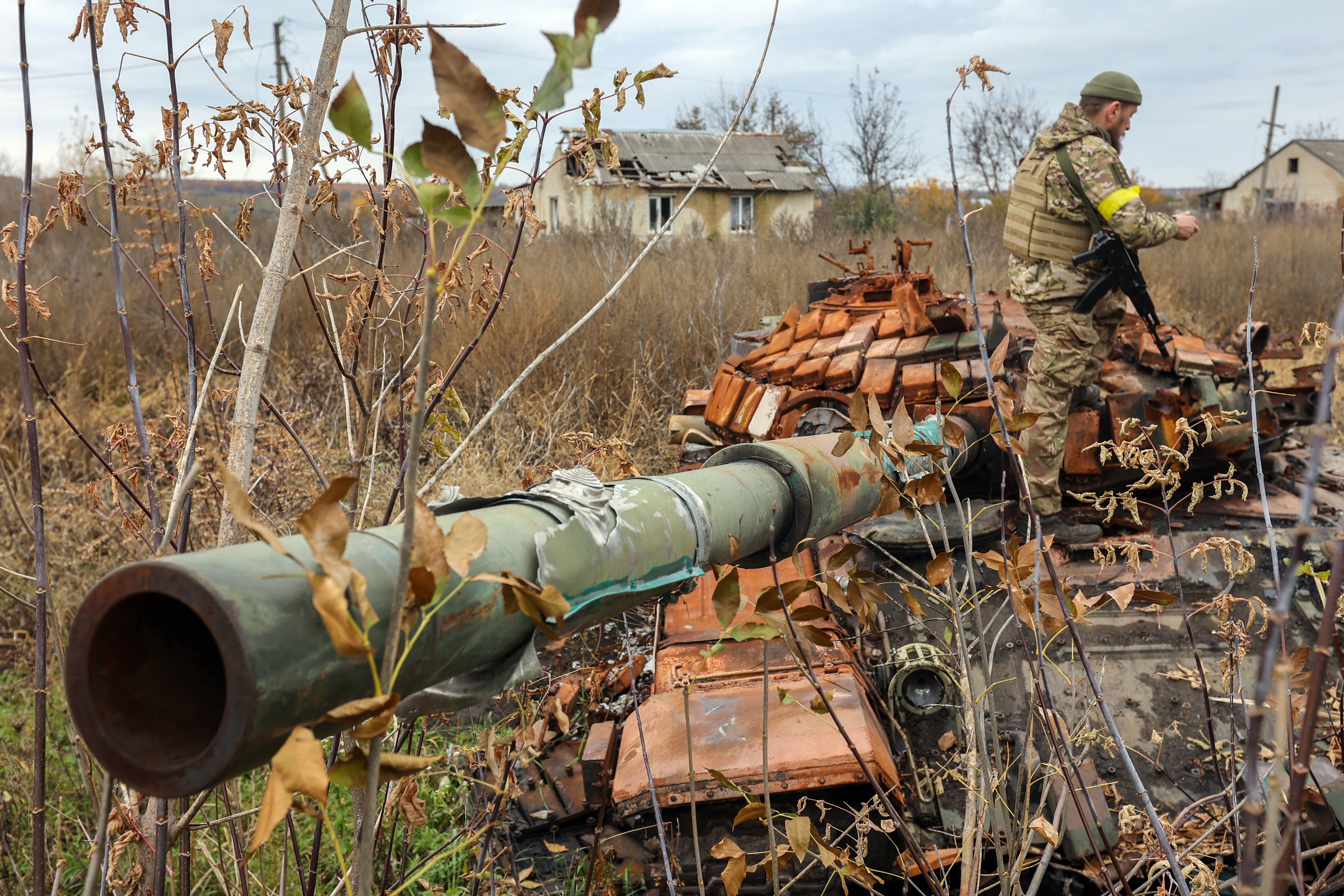Украинский солдат осматривает поврежденный российский танк, Харьковская область