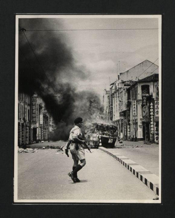 Сингапурский солдат на фоне подожжённого протестующими автобуса, октябрь 1956 года
