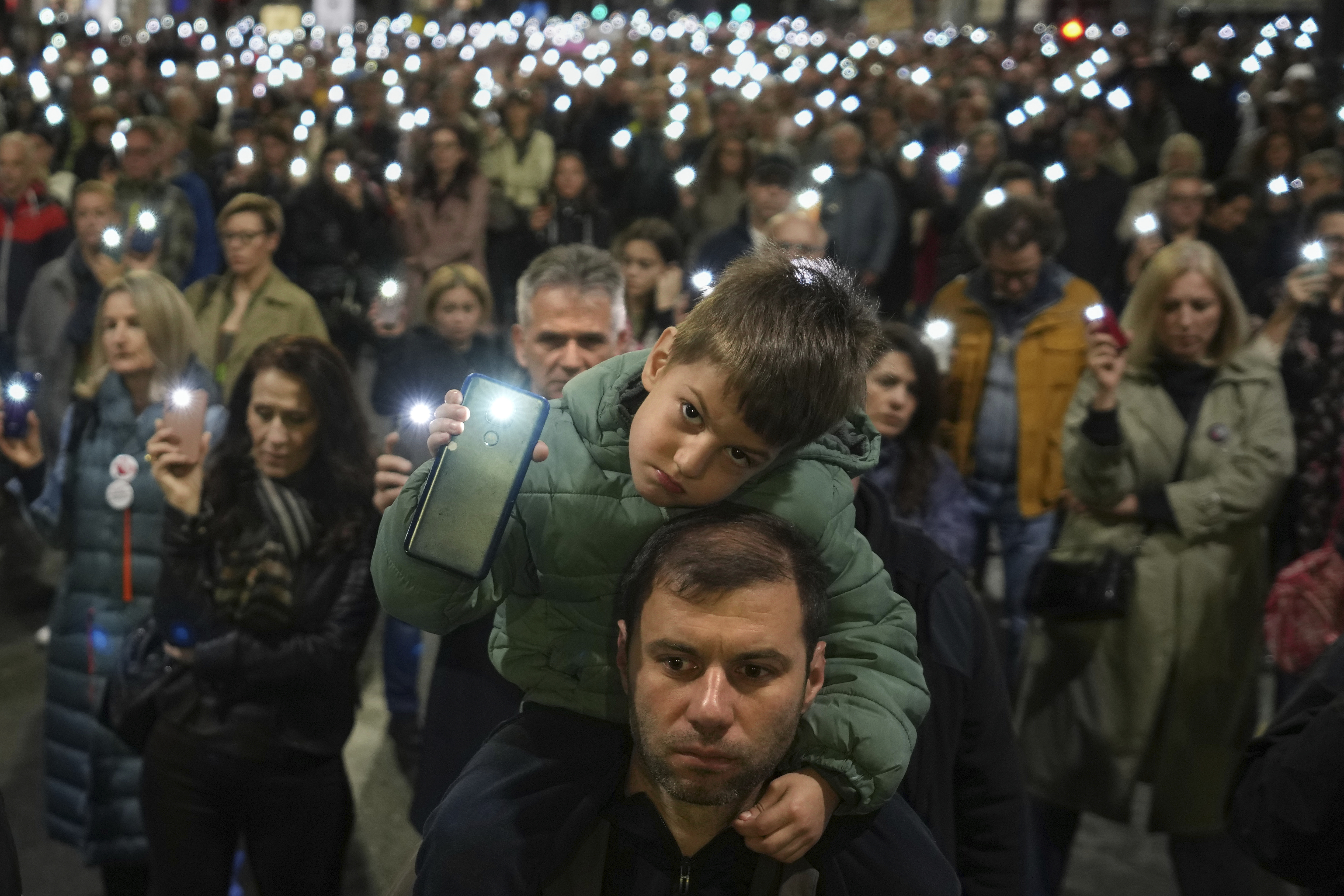 Люди стоят в молчании и держат включенные фонарики на мобильных телефонах в память о жертвах обрушения железнодорожного бетонного навеса, которое стало причиной массовых антиправительственных выступлений в Сербии