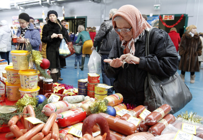Пожилая женщина считает деньги у прилавка. Ставропольский край, РФ