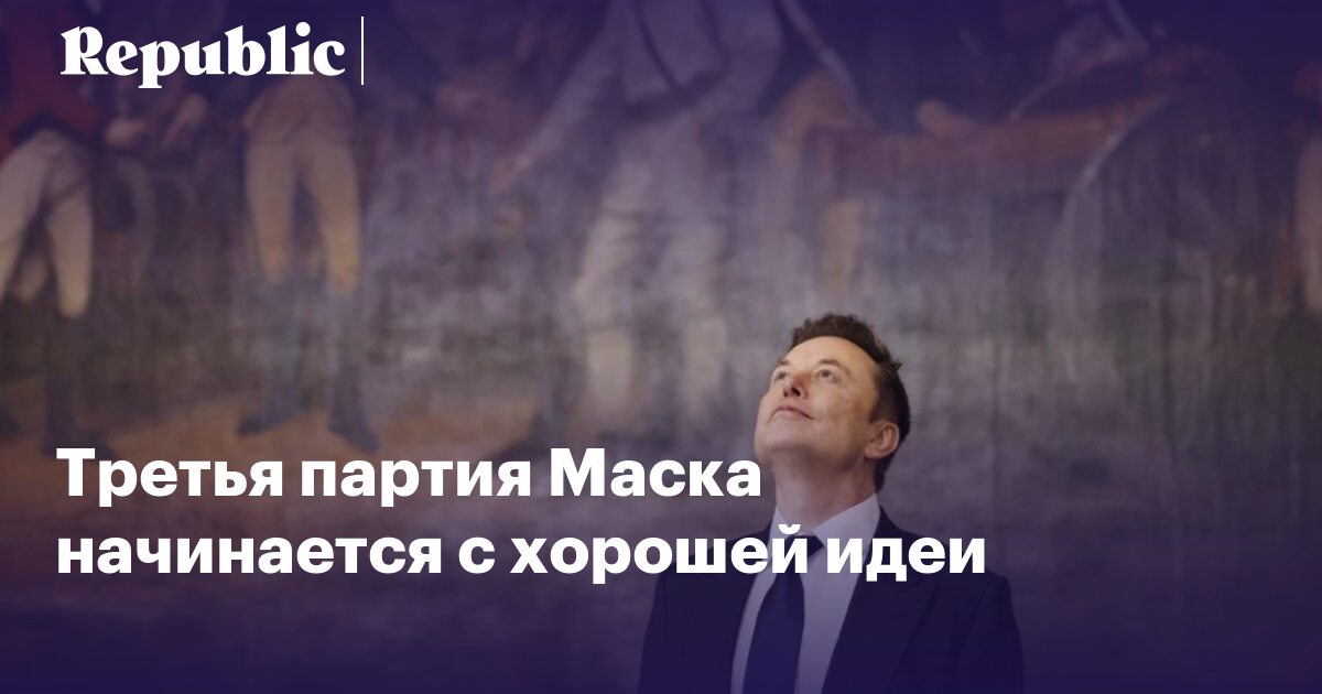 Илон Маск наконец-то сделал нечто предсказуемое (по крайней мере, для миллиардера с политическими амбициями): он заявил, что запускает третью партию, цель которой — сокращение дефицита бюджета. Вместо привычной предвыборной мечты No Labels (неофициальная партия в США. — Republic), когда благородные доноры вкладывают деньги в воображаемого «белого рыцаря», который так и не появляется, мы, возможно, получим партию «Америка», в рамках которой самый богатый человек в мире намерен вложить свое состояние, как он сам заявил, в «чрезвычайно сконцентрированную силу в точном месте на поле боя».