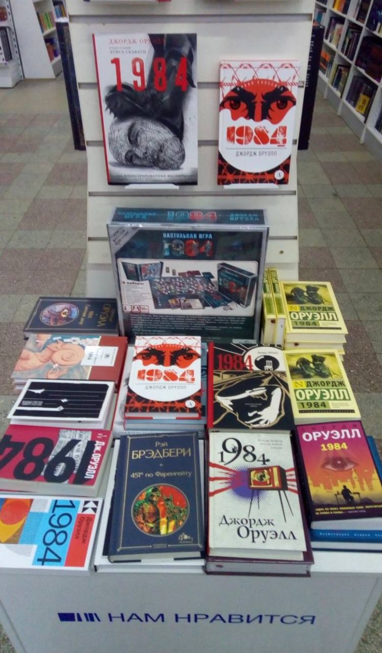 «На фотографии — выкладка книг в одном магазине одного города. Множественные оруэллы и один Бредбери создают вместе одно цельное послание. И даже понятно какое»