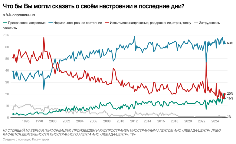 — В одном из последних исследований «Левада-Центра» говорится: «Большая часть россиян пребывает в нормальном, ровном состоянии, немного снижается доля тех, кто говорит, что пребывает в прекрасном настроении, и незначительно растет доля тех, кто испытывает негативные эмоции». Как объяснить этот феномен на фоне непростых внешнеполитических событий?