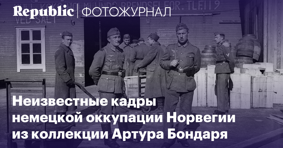 Продолжая работу с найденными архивами Второй мировой, Артур Бондарь специально для Republic собрал в одном материале ранее неизвестные снимки оккупации Норвегии — уже не с моря, а с суши. Солдатские кадры вермахта и люфтваффе показывают первые дни вторжения: горящий Нарвик, разрушенную инфраструктуру и быт оккупированных городов, патрули горных егерей у станции Бьорнфьель, портовую рутину с участием военнопленных, военные кладбища. Три разрозненных архива складываются в цельный взгляд на жизнь страны под оккупацией — от боевых действий до повседневности и принудительных работ.