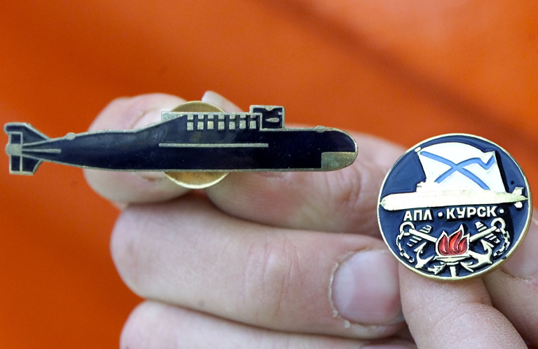 Значки в честь атомной подлодки «Курск» на уличном рынке в Санкт-Петербурге, 18 мая 2001 года