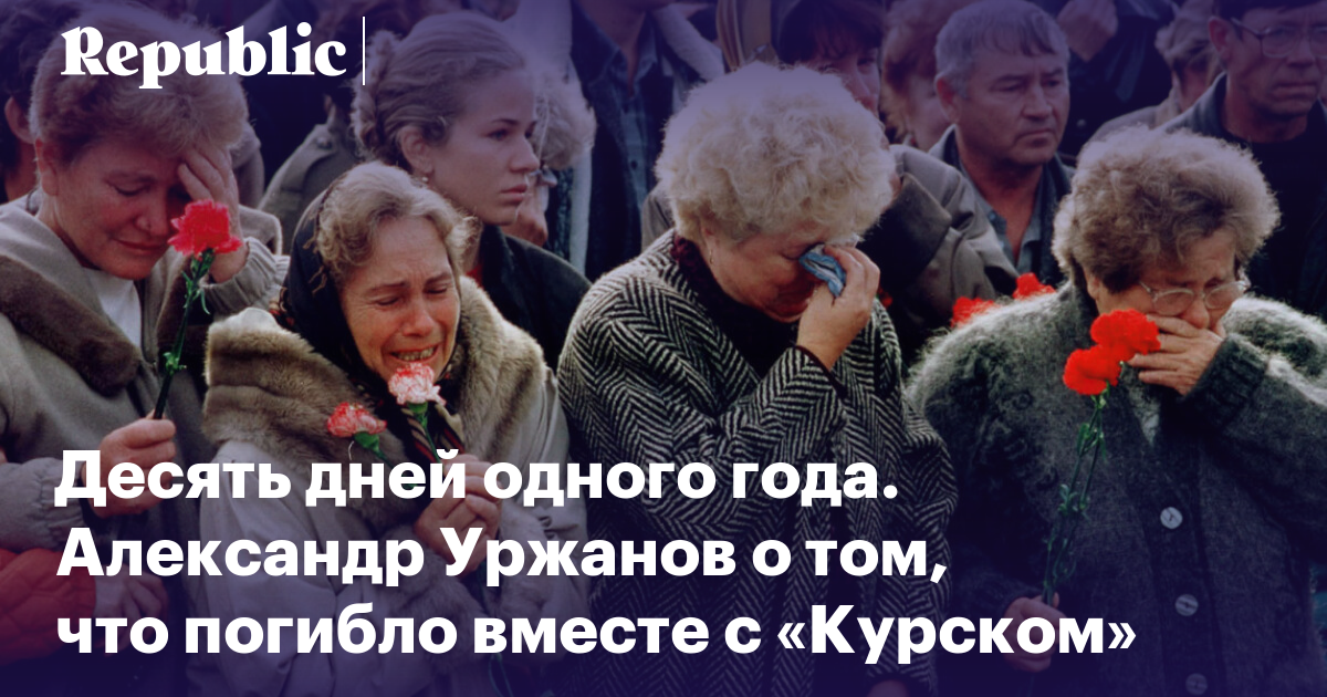12 августа 2000 года подводная лодка «Курск» затонула во время учений в Баренцевом море. Но официально о гибели экипажа было объявлено только 22 августа — десять дней вся страна напряженно следила за тем, как разворачивалась катастрофа. Гибель «Курска» принято считать первым испытанием Владимира Путина на посту президента России — здесь и встреча в Видяево со вдовами, и фраза «Она утонула», сказанная в интервью Ларри Кингу. Оглядываясь на эти события спустя четверть века, Александр Уржанов не узнает страну, в которой они произошли.