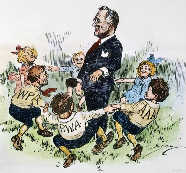«Новый курс». Карикатура Клиффорда Берримана, на которой изображен президент Рузвельт в хороводе из ведомств его политики «нового курса», 1935 год