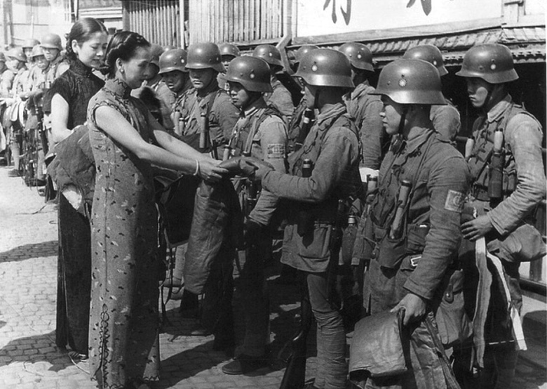 Жена Чан Кайши Сун Мэйлин приветствует юных китайских солдат. До 1937 года гоминьдановскую армию обучали немецкие инструкторы — отсюда и характерные каски