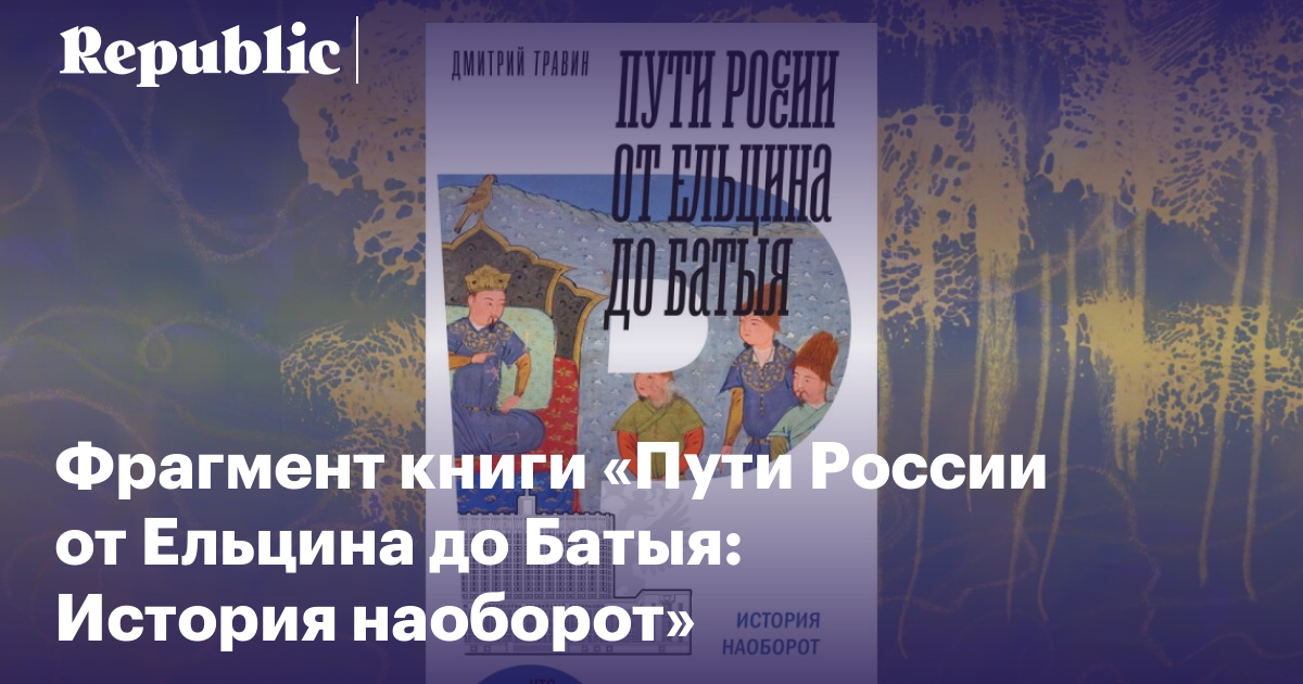В издательстве НЛО вышла книга экономиста, политолога и автора Republic Дмитрия Травина, которую сам он называет особенно «социотерапевтичной». Постепенно отматывая вспять ход российской истории, он останавливается на моментах, где все могло, как многим сейчас кажется, сложиться иначе. Анализируя их, он доказывает, что ключевые повороты российской истории произошли не из-за особой национальной культуры или ментальности, а стали следствием вполне рациональной реакции на те задачи, которые стояли перед государством.