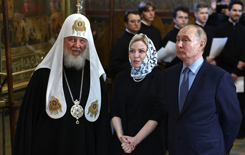 Патриарх Кирилл, Ольга Любимова и Владимир Путин в Троице-Сергиевой лавре