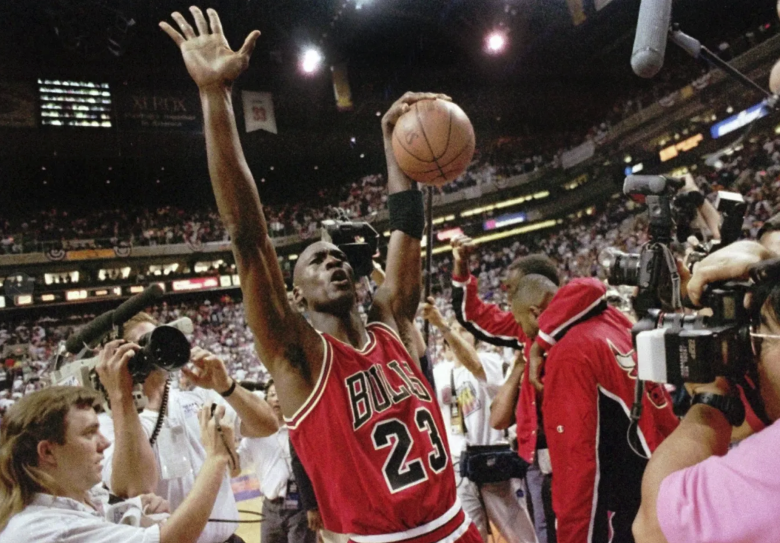 Майкл Джордан празднует завоевание очередного титула NBA с командой Chicago Bulls в 1993 году