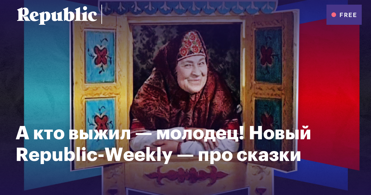 2020-е годы в России — это сказки. На телевидении, в кино, литературе, рекламе, в Кремле. Сказки — главный культурный, общественный и политический жанр. Четырехчасовый Путин на Валдае вчера — это разве не сказка? Сказке — во всех, хороших и плохих, смыслах этого слова — посвящен новый выпуск Republic-Weekly. И вот какие материалы вы сможете в нем прочитать.