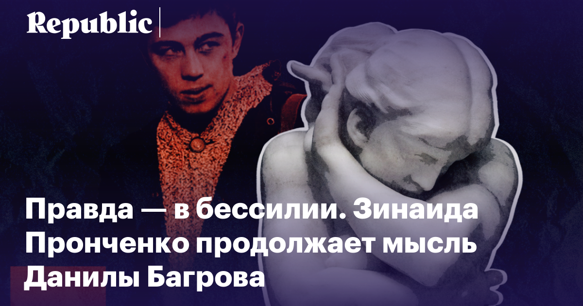 Данила Багров в фильме «Брат 2» говорил, что «сила в правде». Таков и один из самых популярных ответов гостей Юрия Дудя* на последний вопрос блица. Но в чем правда? Главный редактор Republic Зинаида Пронченко* приходит к парадоксальному решению этого уравнения. Она говорит: правда — в бессилии. И вот почему.