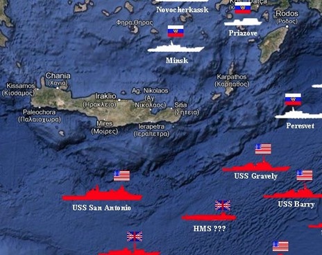 Наглядно демонстрирует, какими силами располагают в данный момент Россия, США и их союзники по НАТО в Средиземном море, картинка от ZeroHedge. У нас здесь 14 кораблей разных классов, у США 7, в том числе флагманское судно USS San Antonio и подводная лодка, судно и подлодка под британским флагом, одно французское и одно немецкое суда (изображение кликабельно).