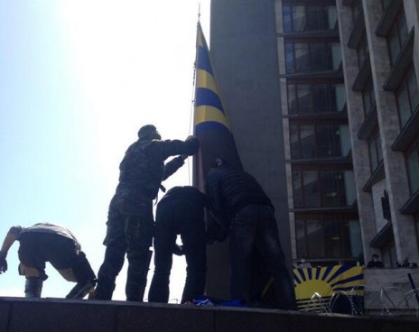 Снятие флага Донецкой области и замена на флаг Донецкой республики. Фото: twitter.com / ostro_v