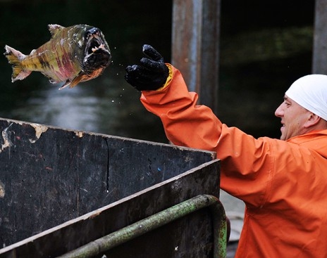 Забой рыбы на лососевом рыбоводном заводе. Фото ИТАР-ТАСС/ Александр Петров