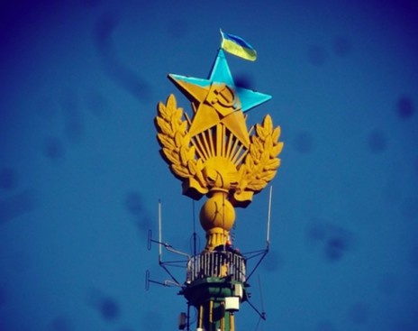 Кроме того, золотая звезда, венчающая шпиль здания, была наполовину перекрашена в голубой цвет.