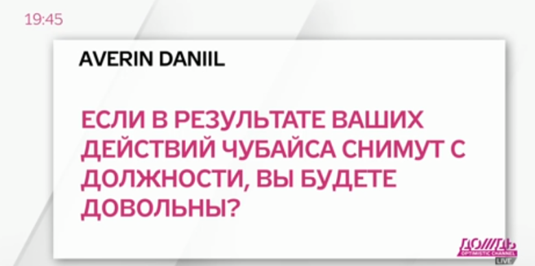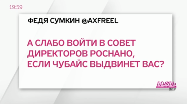 Вопрос Чубайса: «Я не очень готов задавать вопросы, хотя вы знаете, любое высказывание можно легко сделать вопросом». В прошлый раз у него четыре минуты со скрипом ушло на это «легко».