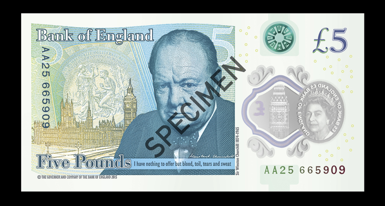 Банк Англии 2 июня представил дизайн новой банкноты достоинством £5, которая будет печататься на полимерном материале. На купюре будет размещено изображение бывшего премьер-министра Великобритании Уинстона Черчилля.