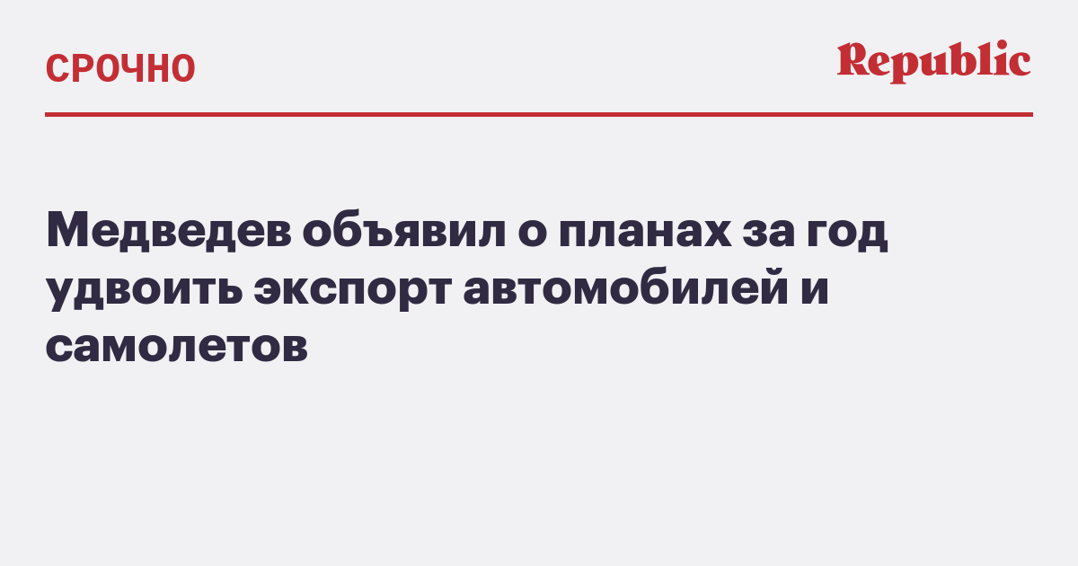 К 2018 году Россия должна удвоить экспорт в сельскохозяйственном и железнодорожном машиностроении, автомобилестроении и авиастроении, заявил премьер-министр РФ Дмитрий Медведев.