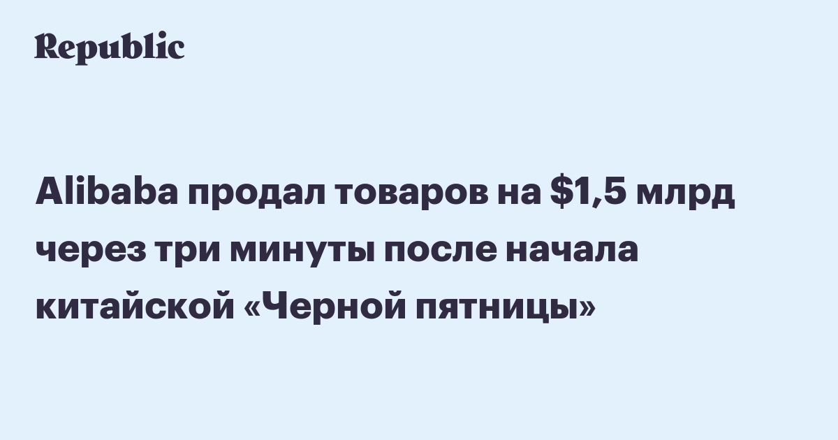 Продажи китайского интернет-ритейлера Alibaba составили $1,5 млрд за первые три минуты после начала «Дня холостяков» – национального праздника в Китае, во время которого действуют большие скидки. Об этом сообщает Reuters.