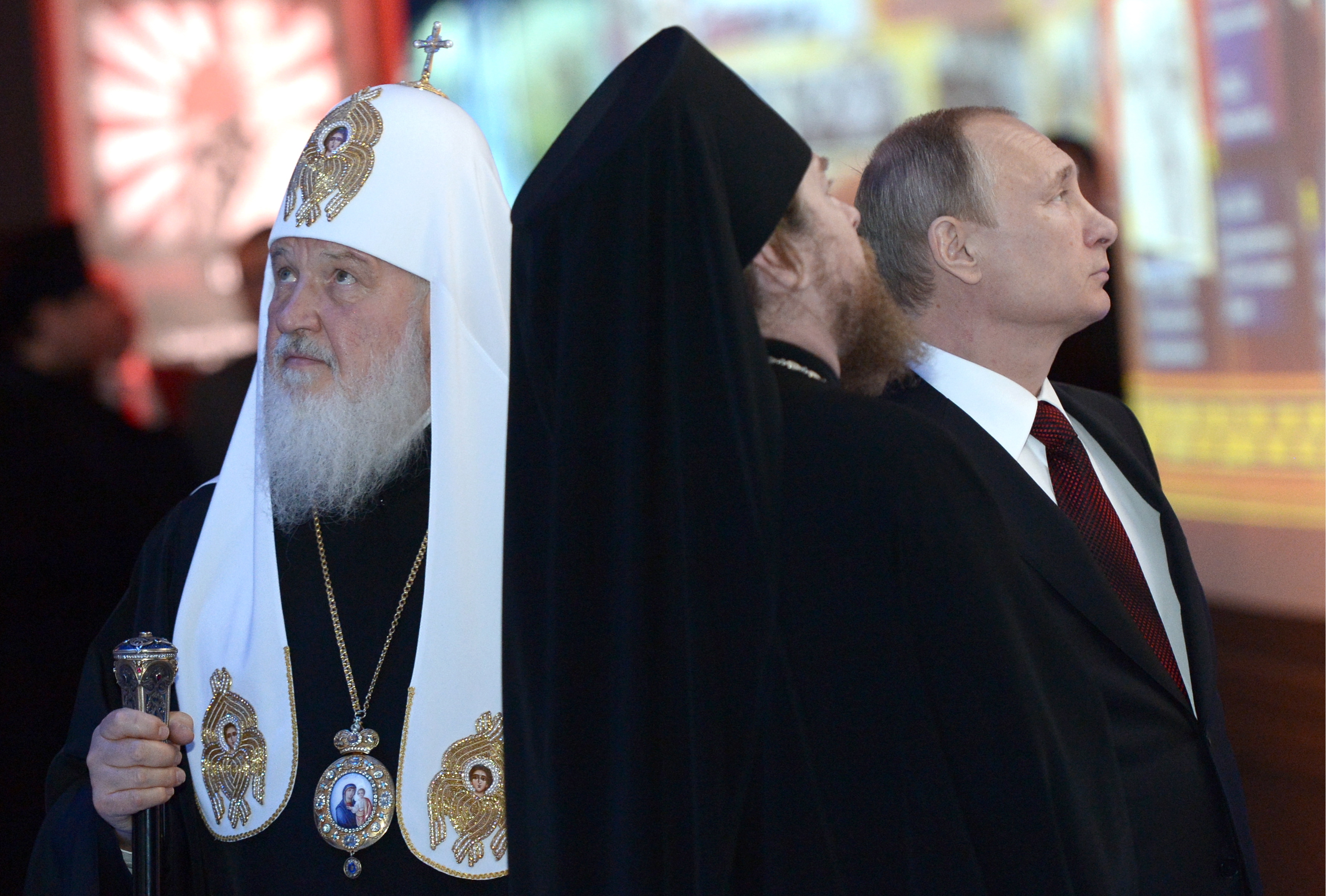 Патриарх Московский и всея Руси Кирилл, епископ Егорьевский Тихон (Шевкунов) и президент России Владимир Путин (слева направо) во время посещения церковно-общественной выставки «Православная Русь»