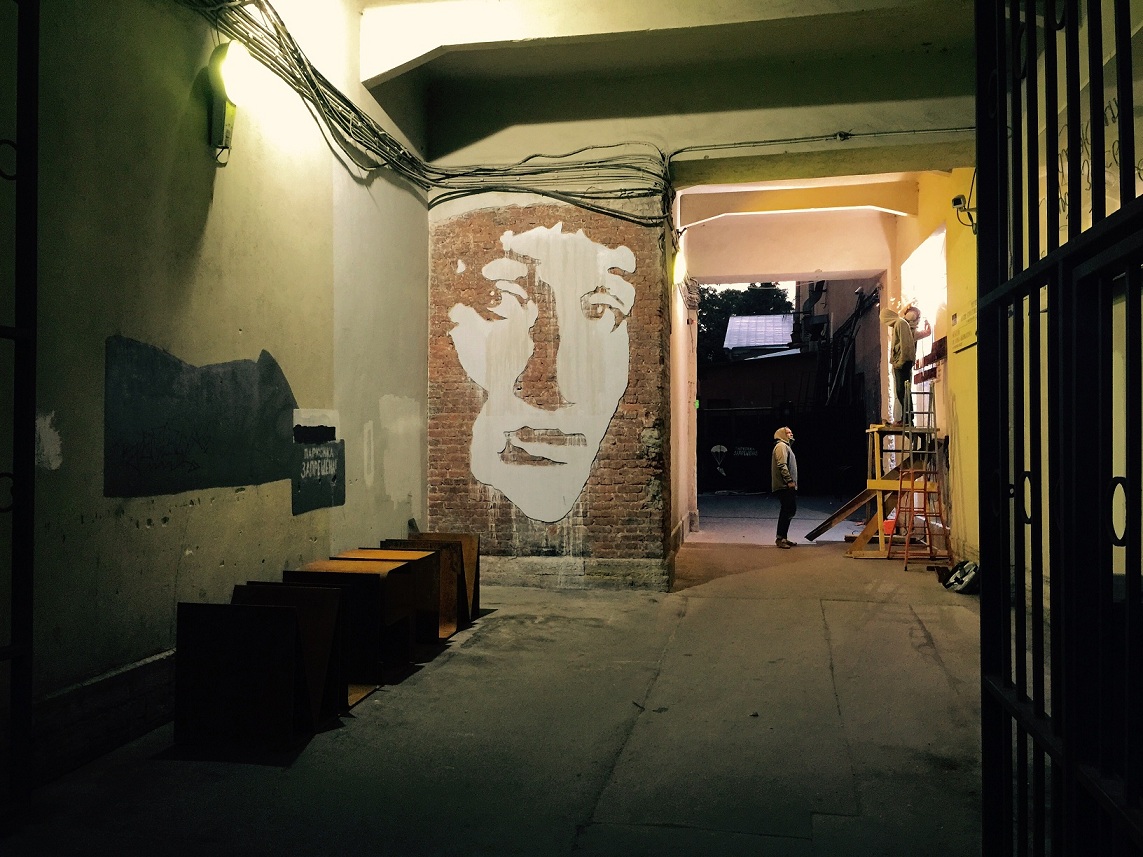 – С Музеем Анны Ахматовой мы начали работать совершенно случайно: в 2005 или 2006 году они нашли нас и обратились с заказом по поводу реконструкции вестибюля. Входная зона получилась удачной, и так началось наше сотрудничество: мы делали все малые формы от элементов навигации до музейного забора. Во входной арке с Литейного проспекта раньше всегда стояли мусорные баки и припаркованные машины, что было совершенно недостойно входа в музей, и в 2016 году директор Нина Ивановна Попова (с 2020 года президент Фонда друзей музея – П.Г.) обратилась с просьбой что-нибудь с этим сделать. Так возник портрет Анны Ахматовой в арке на Литейном проспекте, выполненный в технике сграфито. В отличие от других произведений стрит-арта в городе наша работа, к счастью, не закрашивается и не сбивается.