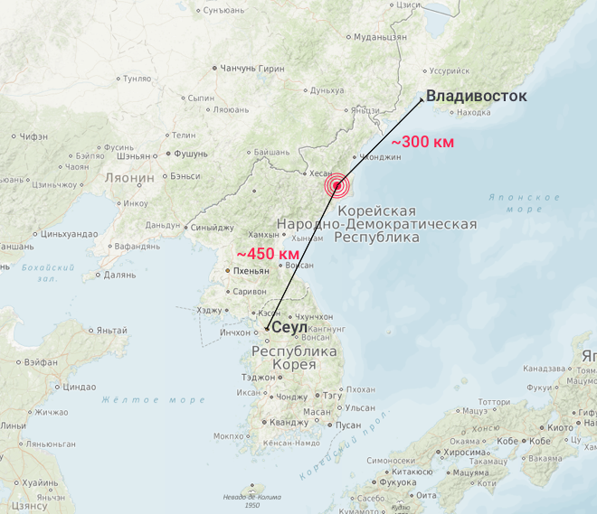 Если вам кажется, что «корейская угроза» где-то далеко и не имеет к нам отношения, то напомним нашу карту, на которой показано, что Владивосток расположен ближе к полигону КНДР для ядерных испытаний, чем Сеул. И в воскресенье на российском Дальнем Востоке также ощущались подземные толчки.